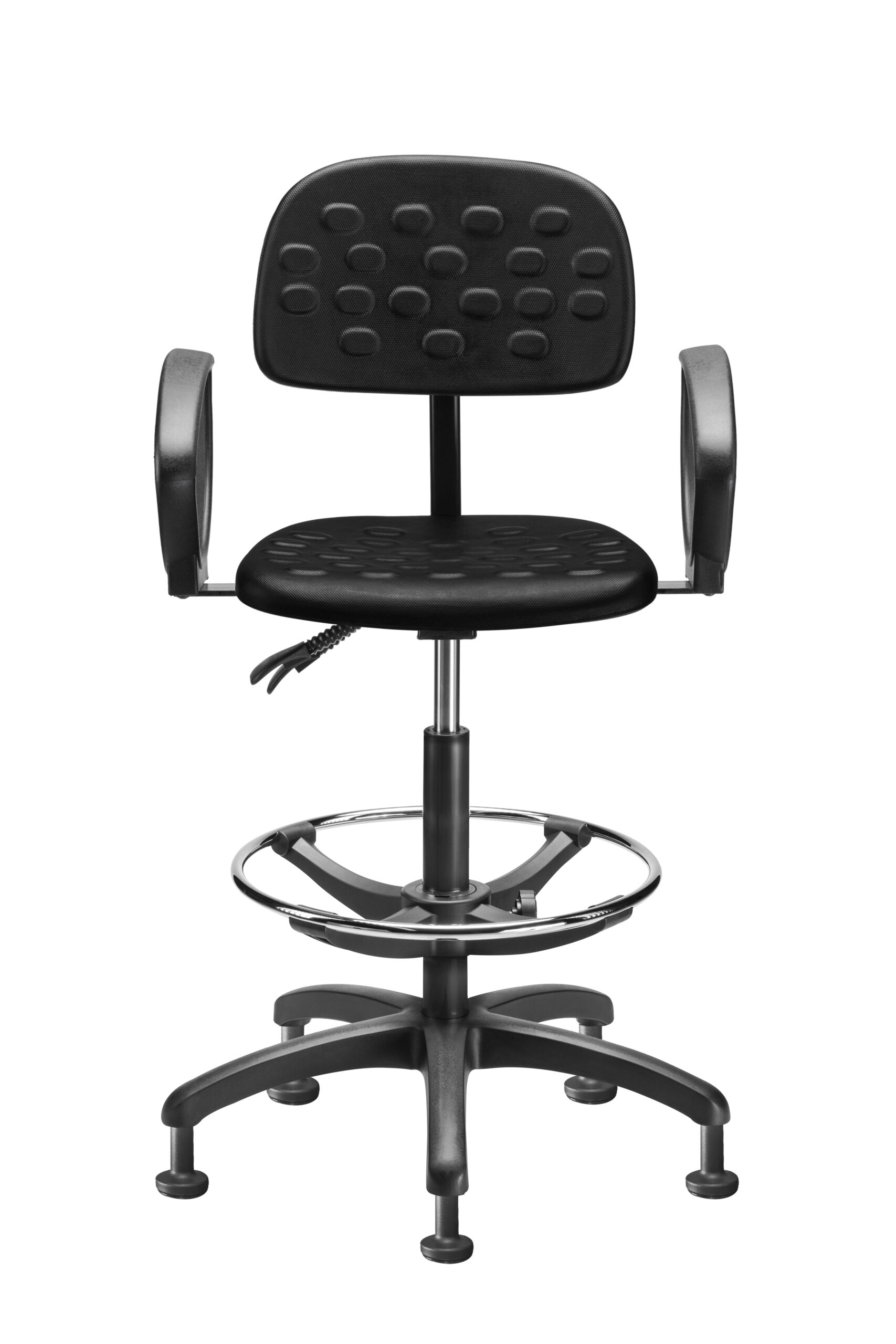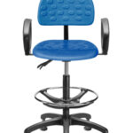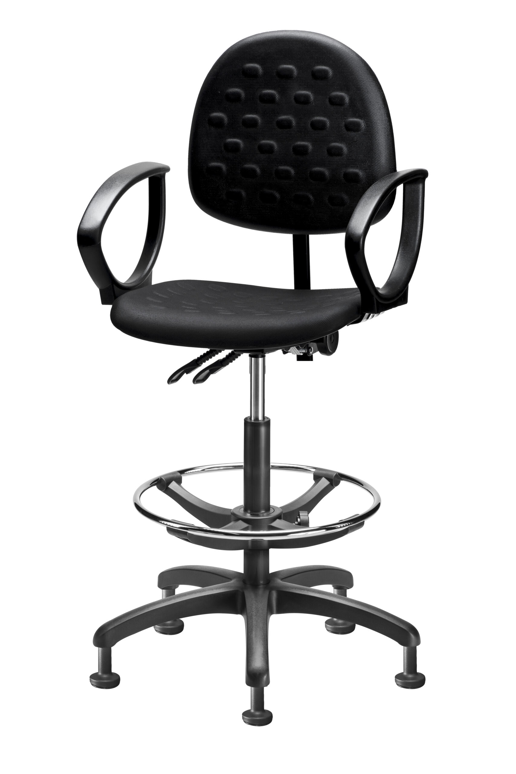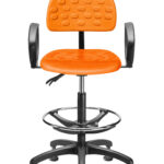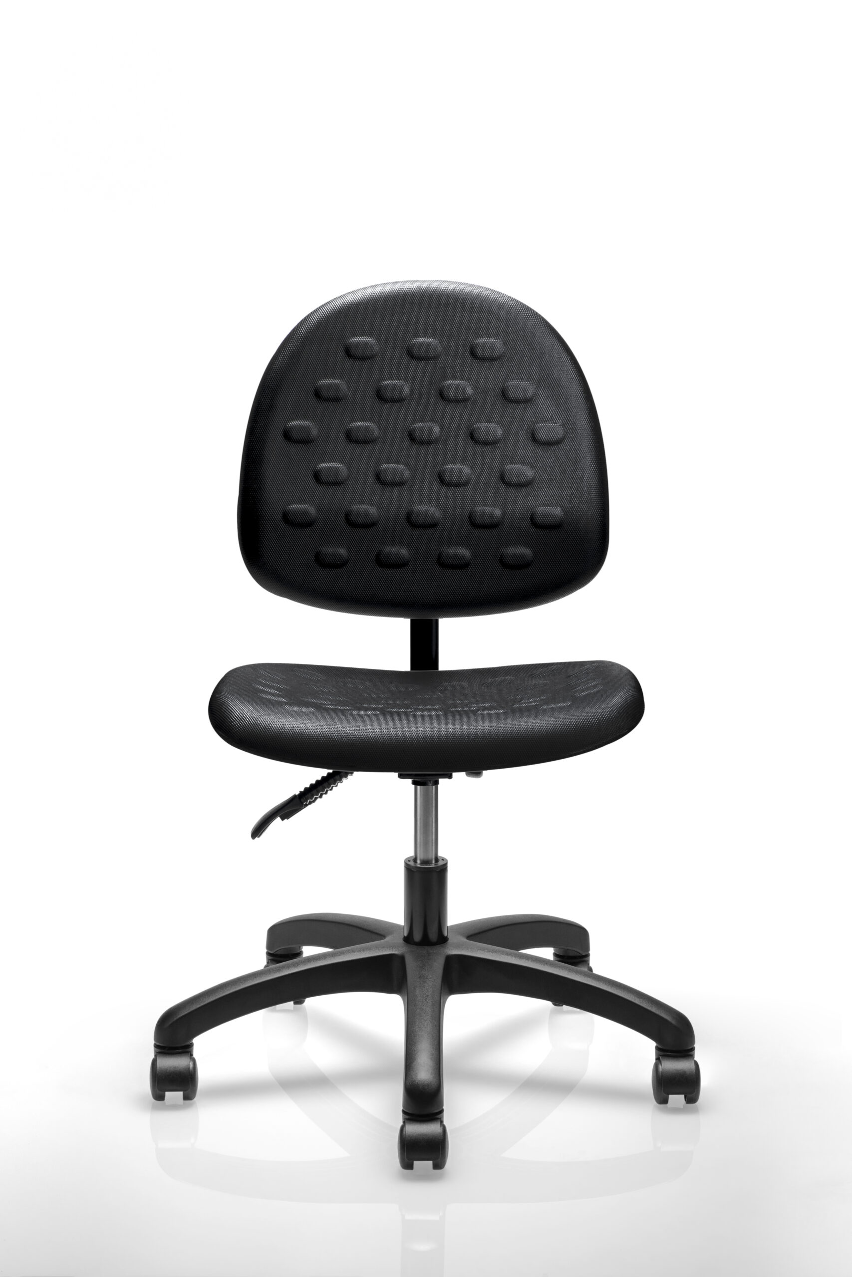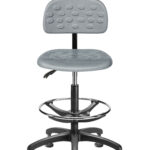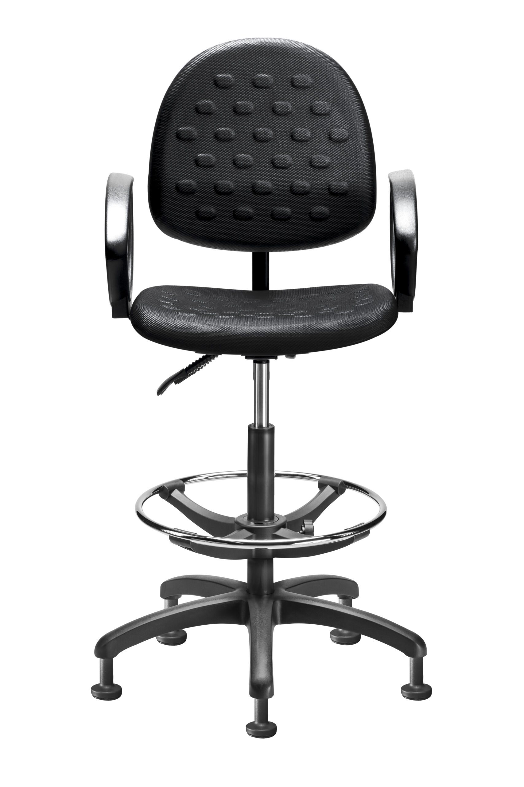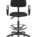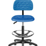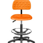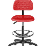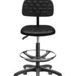 Banco giratorio, asiento redondo de espuma de poliuretano tapizado, mecanismo de ajuste neumático de altura, base de 5 anclas con regatones o rodajas y aro descansapiés.