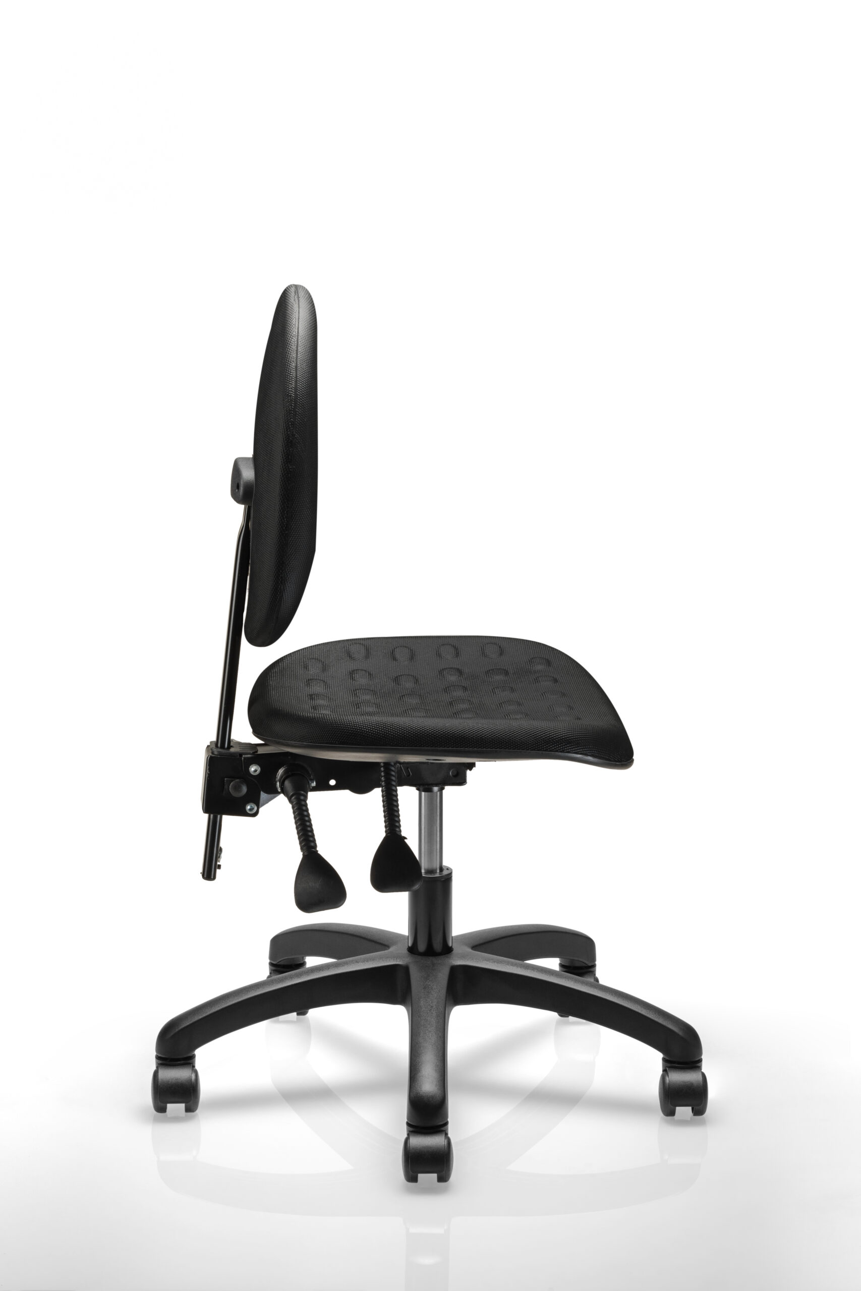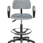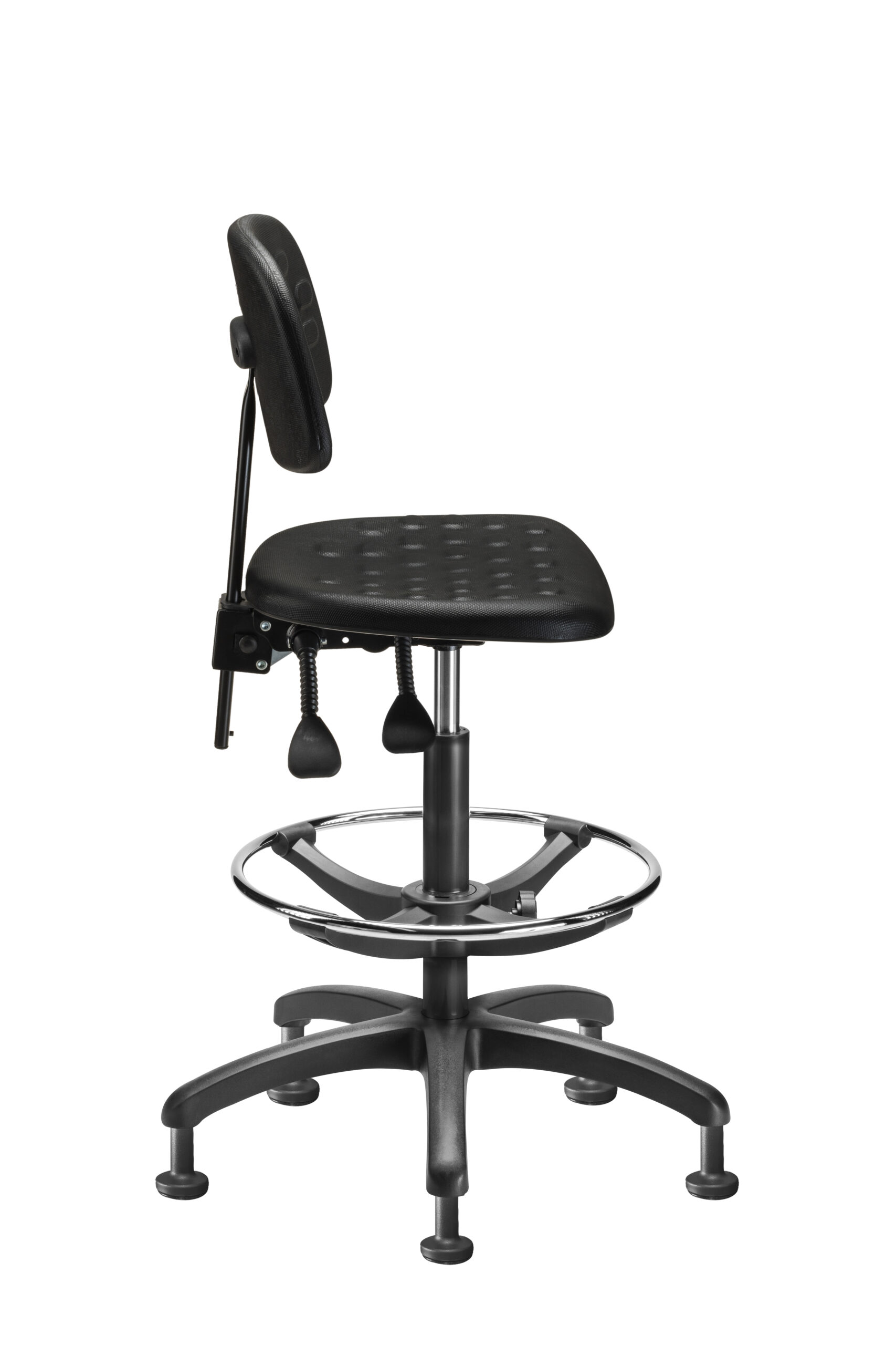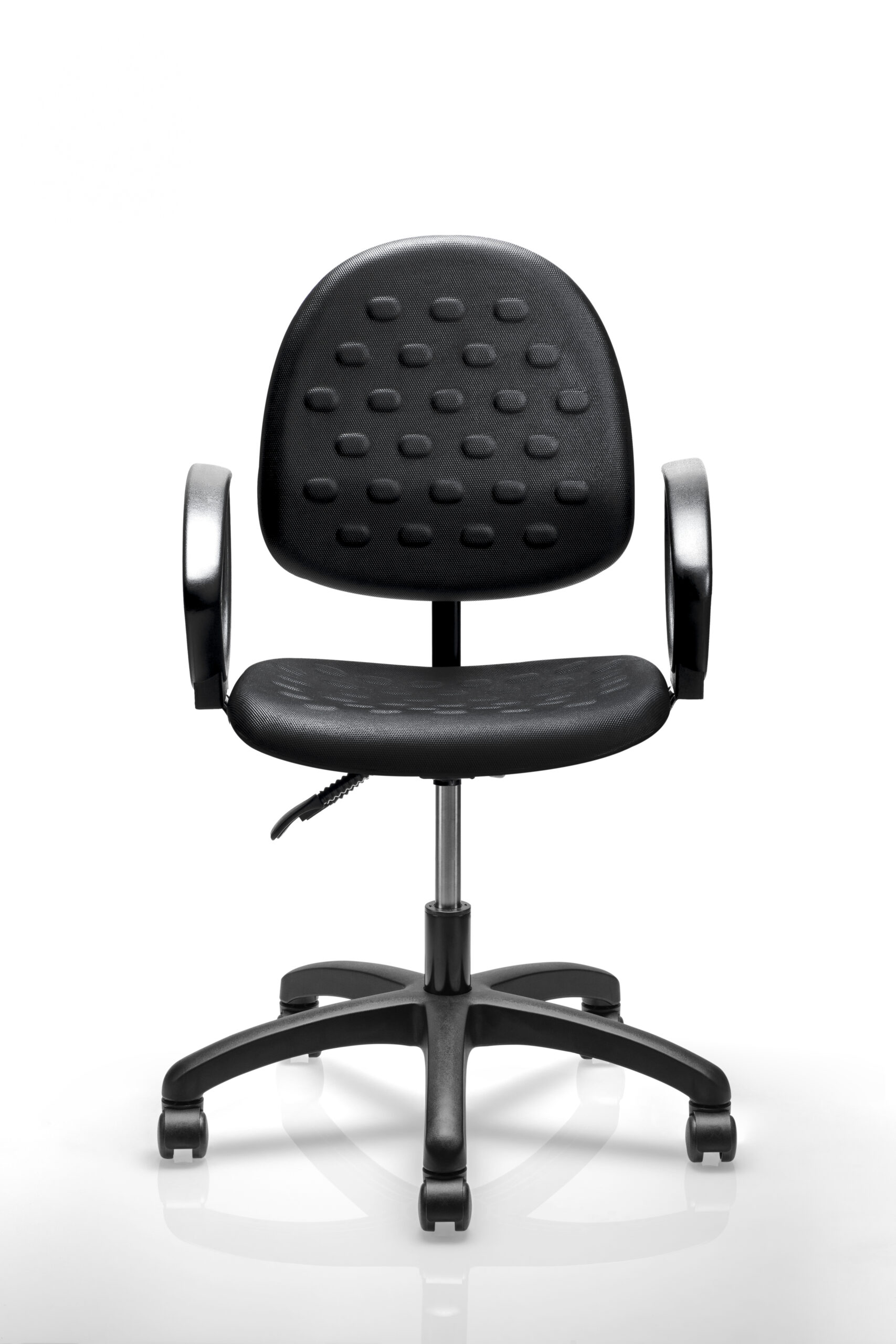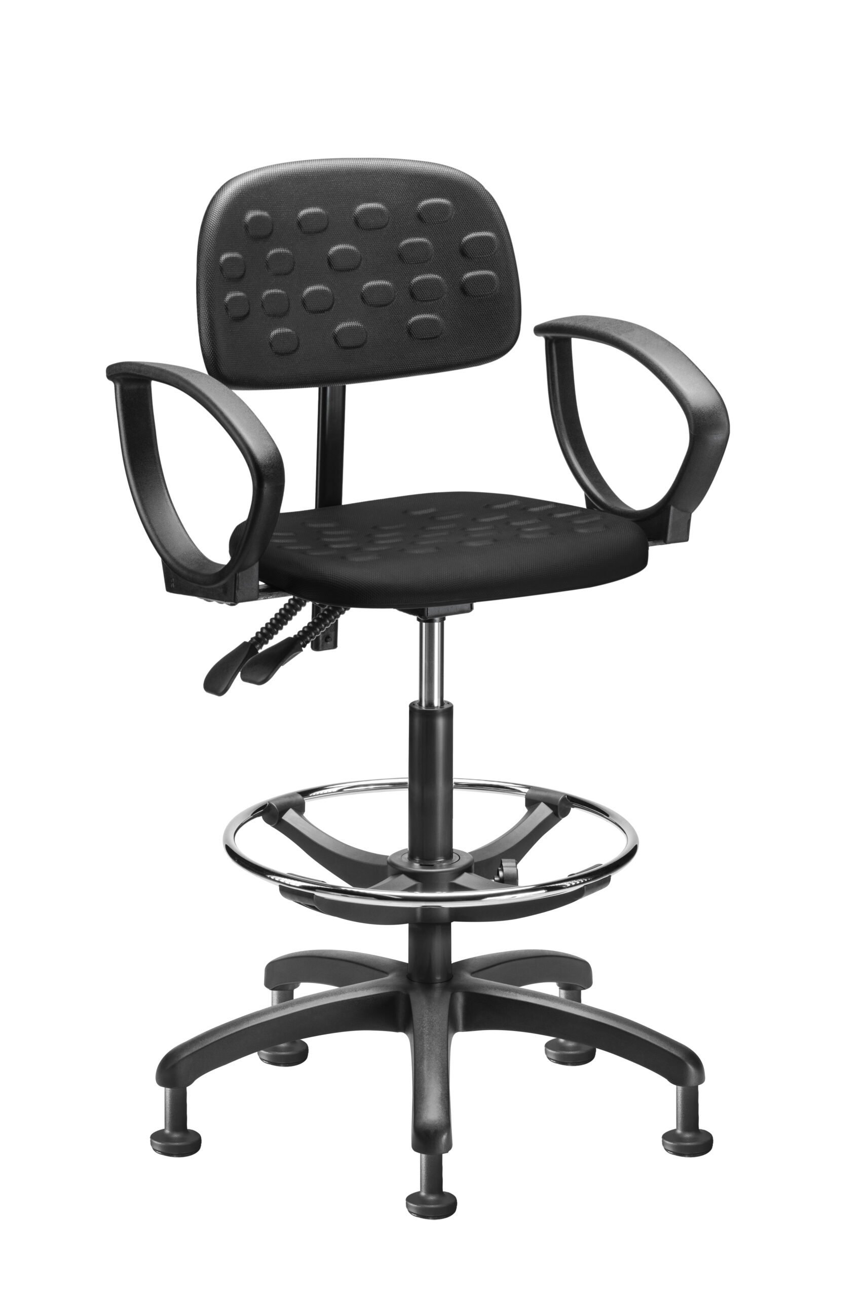 Banco giratorio, asiento redondo de espuma de poliuretano tapizado, mecanismo de ajuste neumático de altura, base de 5 anclas con regatones o rodajas y aro descansapiés.